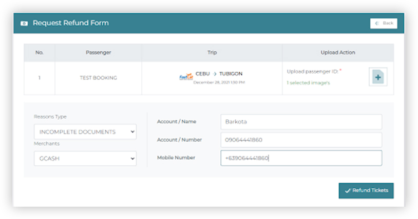 Input your Account Name, Contact Number then click the Refund Tickets button to continue.